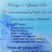 Jumbo Prawn Fish Clam Squid Rice vegetable sauce and slice of fruit 1 small beer1 soft drink1 fresh Juice. Menu price list - Check out Tripadvisor members 14909 candid photos and videos of Menega Cafe. We kozen voor het Menega Special-menu met BBQ-kreeft kokkels calamares en een hele vis.